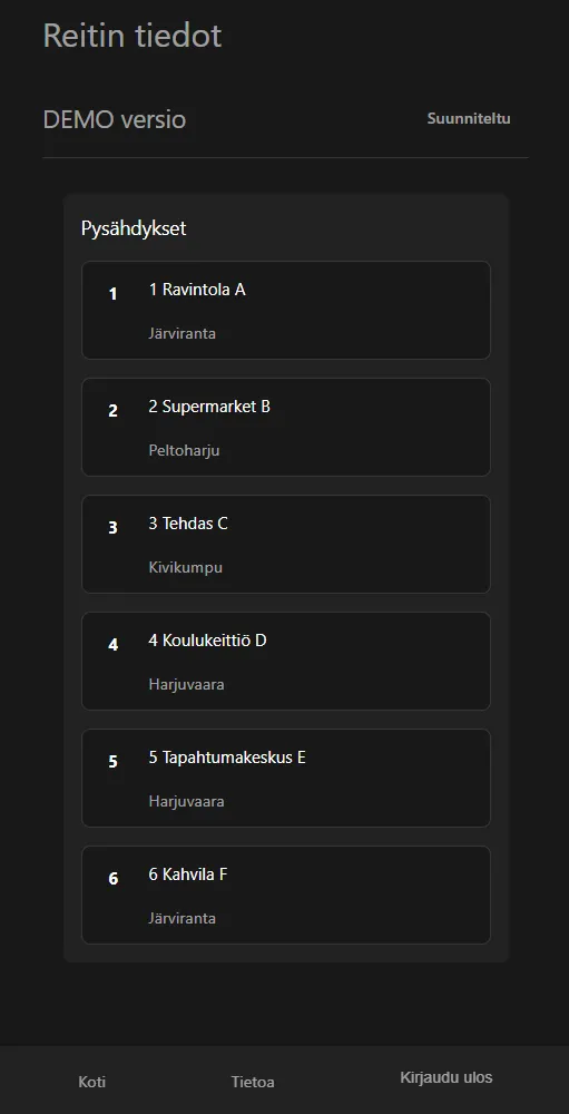 Tällä sivulla näet, miltä ReittiKaveri näyttää kuljettajan puhelimessa tien päällä: pysähdykset selkeänä listana, tärkeimmät tiedot yhdellä vilkaisulla ja jokaisen kohteen tarkennetut ohjeet kuvin ja tekstein. Kun kuski tietää tarkalleen minne ajaa, mistä mennä sisään ja kenelle soittaa ongelmatilanteissa, säästyy aikaa, polttoainetta ja hermoja – jokaisella reissulla.